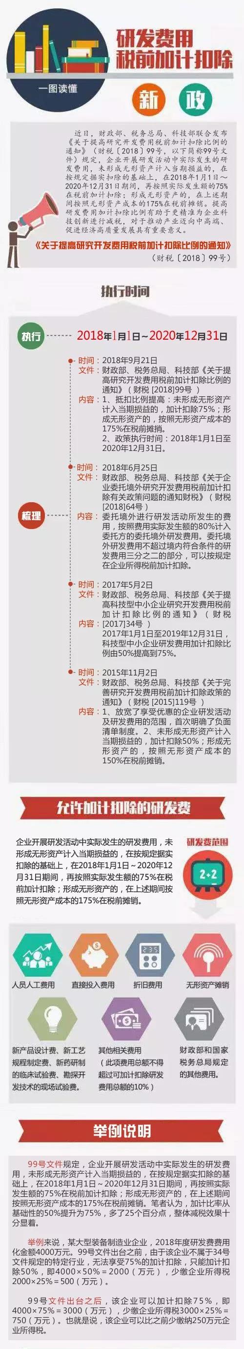 相關(guān)政策:財(cái)政部 稅務(wù)總局 科技部關(guān)于提高研究開發(fā)費(fèi)用稅前加計(jì)扣除比例的通知(財(cái)稅〔2018〕99號(hào))