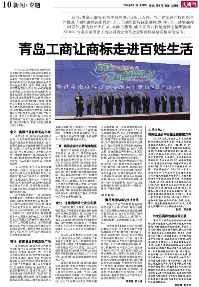 今年5月1日,新《商標(biāo)法》將正式實(shí)施,為宣傳普及商標(biāo)法律知識,全面展示青島商標(biāo)事業(yè)發(fā)展成果,進(jìn)一步營造全社會實(shí)施商標(biāo)戰(zhàn)略的濃厚氛圍,在第14個(gè)世界知識產(chǎn)權(quán)日即將來臨之際,市工商局倡導(dǎo)“讓商標(biāo)走進(jìn)生活”,借世園會盛大開幕之際,宣傳“品牌之都”優(yōu)勢商標(biāo)品牌的影響力和無形價(jià)值,讓品牌融入百姓生活,引導(dǎo)科學(xué)消費(fèi)。