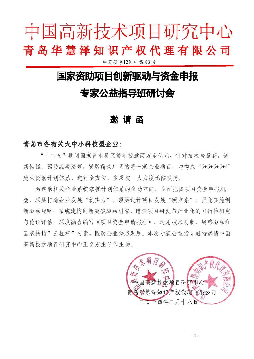 主辦單位:中國(guó)高新技術(shù)項(xiàng)目研究中心、青島華慧澤知識(shí)產(chǎn)權(quán)代理有限公司