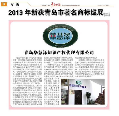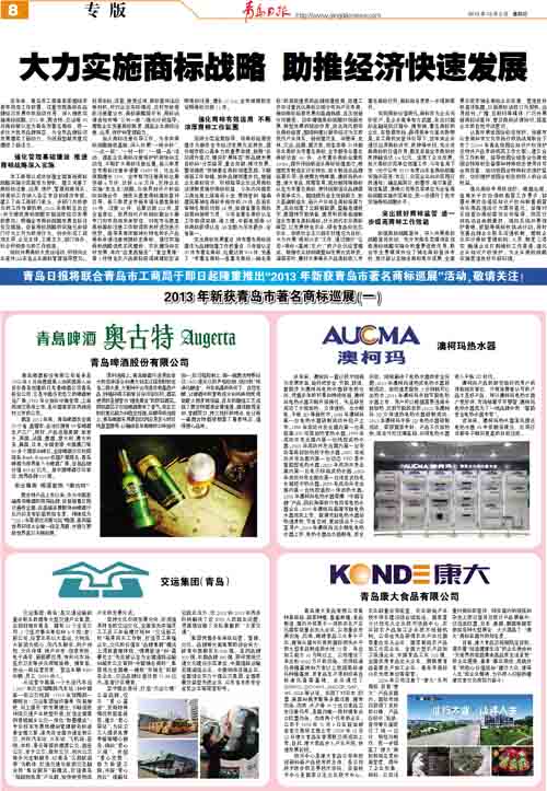 近年來,青島市工商局緊緊圍繞市委市政府工作部署,注重發(fā)揮商標(biāo)在品牌經(jīng)濟發(fā)展中的驅(qū)動作用,深入推進實施商標(biāo)戰(zhàn)略,2013年,奧古特、交運等90件商標(biāo)被認(rèn)定為青島市著名商標(biāo),進一步壯大我市品牌陣容,為全市品牌經(jīng)濟發(fā)展增添了新動力,為創(chuàng)新型城市建設(shè)增添了新活力