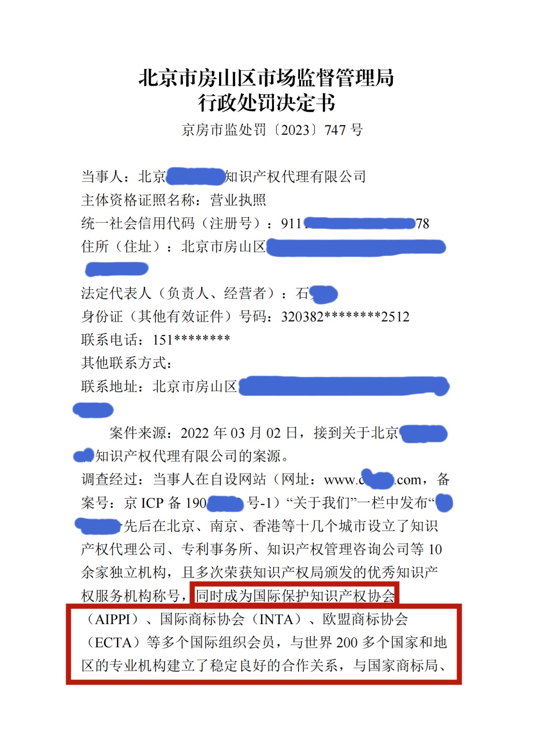 近日,北京市企業(yè)信用信息網(wǎng)發(fā)布了一則處罰信息,北京某知識產(chǎn)權(quán)代理機構(gòu)在自設網(wǎng)站一欄中發(fā)布:“公司先后在北京、南京、香港等十幾個城市設立了知識產(chǎn)權(quán)代理公司、專利事務所、知識產(chǎn)權(quán)管理咨詢公司等10余家獨立機構(gòu)。且多次榮獲知識產(chǎn)權(quán)局頒發(fā)的優(yōu)秀知識產(chǎn)權(quán)服務機構(gòu)稱號,同時成為國際保護知識產(chǎn)權(quán)協(xié)會(AIPPI)、國際商標協(xié)會(INTA)、歐盟商標協(xié)會(ECTA)等多個國際組織會員,與世界200 多個國家和地區(qū)的專業(yè)機構(gòu)建立了穩(wěn)定良好的合作關系,與國家商標局、中國國家專利局、中國科學院、國家科技部、國家商務部一直保持著良好的協(xié)作關系”的公司簡介和宣傳用語與實際情況不符,涉嫌虛假宣傳。