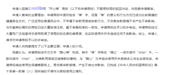 商評委:我委認為,申請商標由中文文字“開心禪”構(gòu)成,其中“禪”字除在“禪讓”一詞中讀作“shàn”外,一般均讀作“chán”,為佛教用語或泛指佛教的事物,與“開心”文字組合使用并未使其含義發(fā)生實質(zhì)改變,申請商標指定使用在保健等服務(wù)上,易傷害宗教感情,產(chǎn)生不良社會影響,已構(gòu)成《中華人民共和國商標法》第十條第一款第(八)項所指的不得作為商標使用之情形。