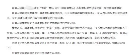 商評委:我委認為,申請商標由純文字“悟能”組成,該文字常在佛教用語中出現(xiàn),作為商標使用易傷害宗教人士感情,從而造成不良社會影響,屬于《中華人民共和國商標法》第十條第一款第(八)項規(guī)定之情形。申請人提供的在案證據(jù)不足以證明申請商標在中國大陸地區(qū)經(jīng)過使用已具有顯著特征,可以作為商標注冊。