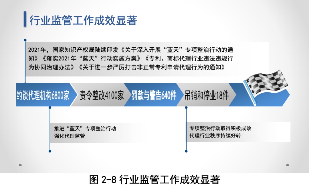 行業(yè)監(jiān)管工作成效顯著。國家知識產(chǎn)權(quán)局深入推進“藍天”專項整治行動,強化代理監(jiān)管。藍天行動開展以來,累計約談代理機構(gòu)6800家,責(zé)令整改4100家,作出罰款與警告640件,吊銷和停業(yè)18件。專項整治行動取得積極成效,代理行業(yè)秩序持續(xù)好轉(zhuǎn)。