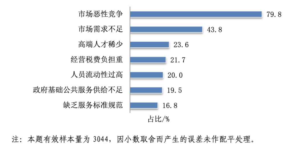 據(jù)調(diào)查顯示,79.8%的知識產(chǎn)權(quán)服務(wù)機構(gòu)認為在發(fā)展中遇到的主要問題是市場惡性競爭,其次還有市場需求不足、高端人才稀少、經(jīng)營稅費負擔(dān)重、人員流動性過高、政府基礎(chǔ)公共服務(wù)供給不足以及缺乏服務(wù)標準規(guī)范等等問題。另外,在新冠疫情影響下,多數(shù)服務(wù)機構(gòu)的各項經(jīng)營活動效率均有所降低,疫情影響下超過七成服務(wù)機構(gòu)的業(yè)務(wù)拓展效率有所降低。