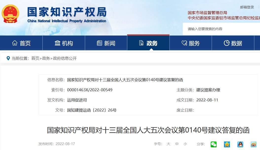 國家知識(shí)產(chǎn)權(quán)局對十三屆全國人大五次會(huì)議第0140號建議答復(fù)的函