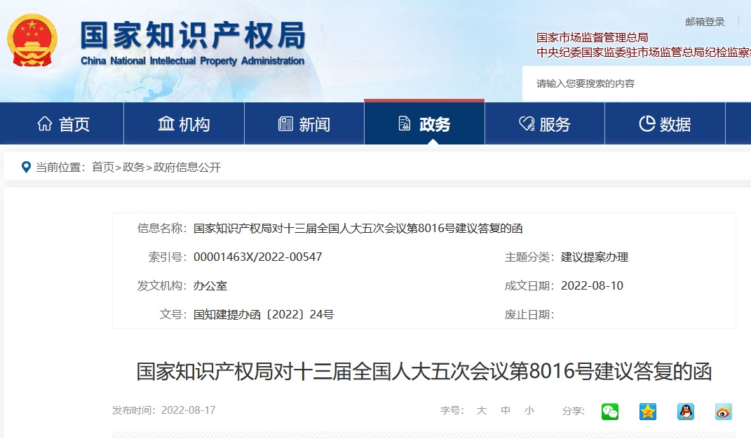 國(guó)家知識(shí)產(chǎn)權(quán)局對(duì)十三屆全國(guó)人大五次會(huì)議第8016號(hào)建議答復(fù)的函