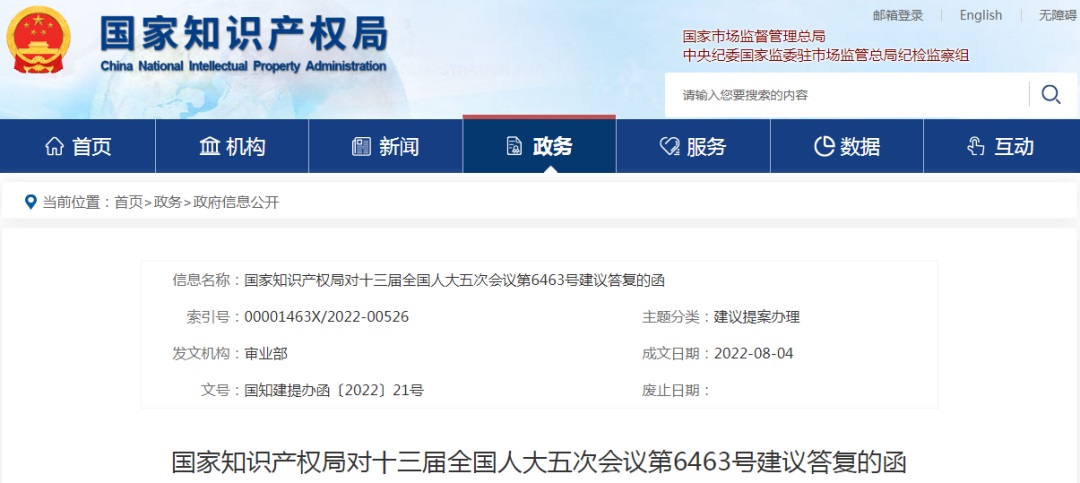 國家知識產權局對十三屆全國人大五次會議第6463號建議答復的函