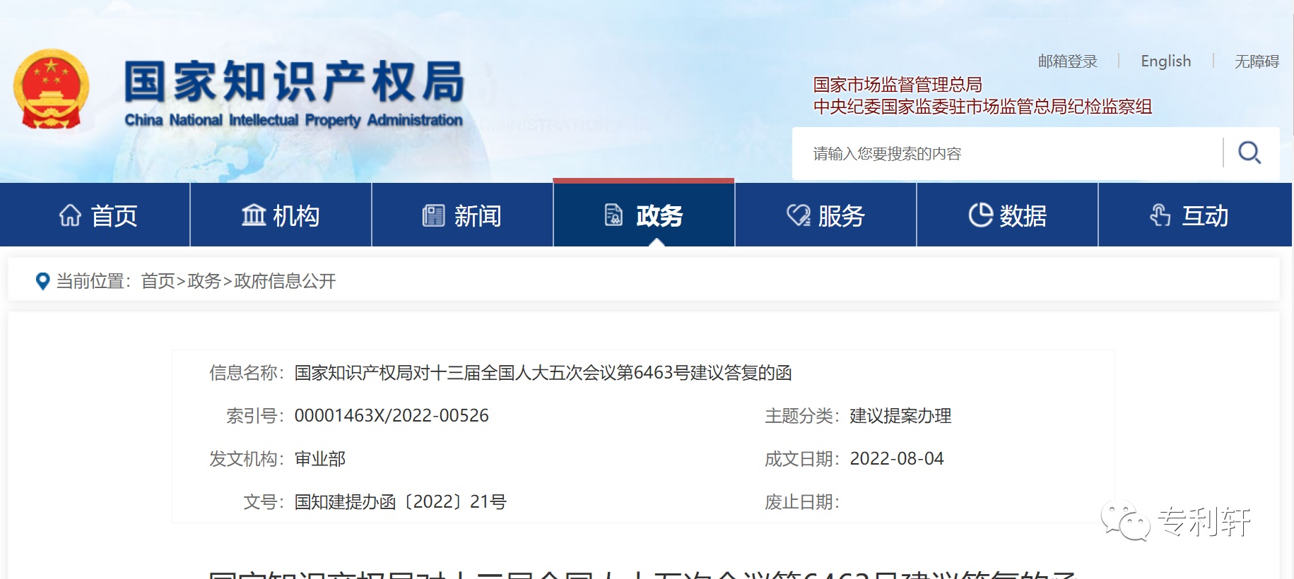 國(guó)家知識(shí)產(chǎn)權(quán)局對(duì)十三屆全國(guó)人大五次會(huì)議第6463號(hào)建議答復(fù)的函