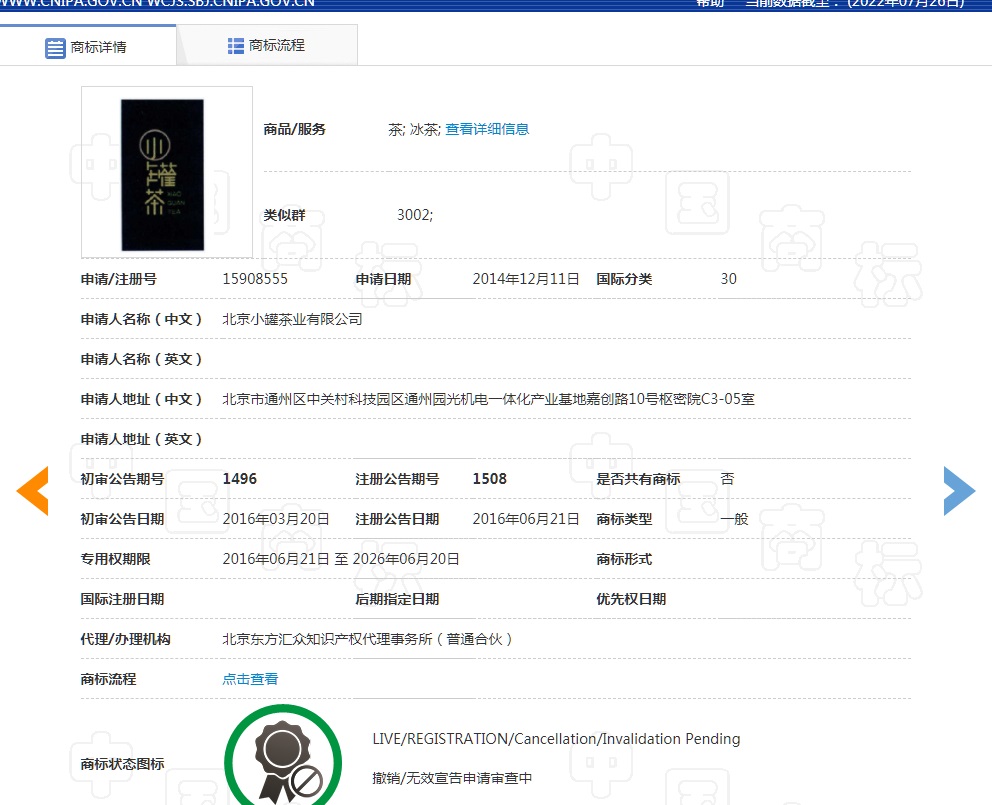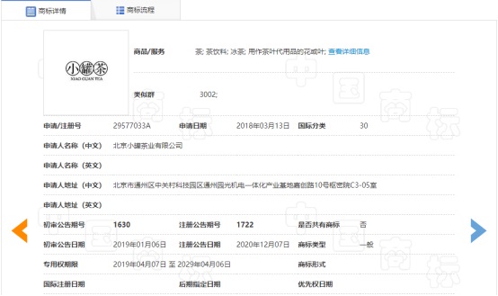 經(jīng)過查詢我們可以看到,“小罐茶”已經(jīng)成功注冊商標(biāo):