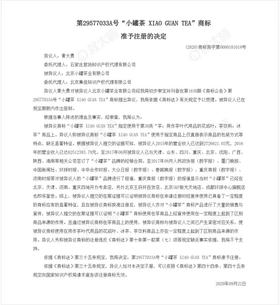 事實也正是如此,北京小罐茶業(yè)有限公司創(chuàng)立于2014年,創(chuàng)立初便嘗試申請注冊了以“小罐茶”為名的商標(biāo),但也確實因為注冊產(chǎn)品類別缺乏顯著性而被駁回,然后便開始了無休止的駁回復(fù)審,期間北京小罐茶業(yè)有限公司也是確實將產(chǎn)品放在第一位,用心做好茶,并且也是收獲一致好評和媒體宣傳報道,一直持續(xù)到2018年重新提交注冊并且再次進入駁回復(fù)審階段,通過提供公司經(jīng)營創(chuàng)收產(chǎn)生的影響力,與多地多家公司簽訂合作合同,具有一定程度的大眾辨識度,加上媒體報道等相關(guān)證據(jù),終于在2020年九月份,商標(biāo)局正式準(zhǔn)予注冊!