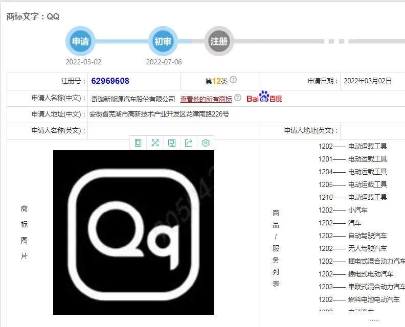 通過(guò)查詢(xún)發(fā)現(xiàn),奇瑞汽車(chē)在今年3月就已為奇瑞 QQ 品牌注冊(cè)全新商標(biāo),可謂相當(dāng)具有前瞻性了。