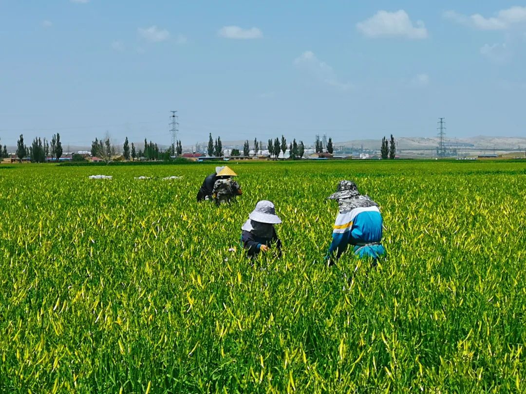 盛夏的七月,走進寧夏吳忠市鹽池縣惠安堡鎮(zhèn)大壩村,金燦燦的朵朵黃花鑲嵌在綠葉間格外耀眼,一個個忙碌的身影穿梭在基地里,正在作業(yè)采摘的就是葉片細長發(fā)散的植物——黃花菜。