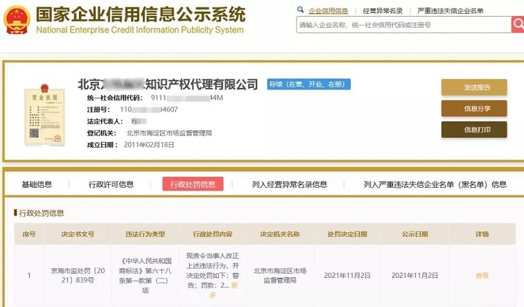 近日,國(guó)家企業(yè)信用信息公示系統(tǒng)發(fā)布了一則行政處罰信息。北京一知識(shí)產(chǎn)權(quán)代理有限公司在商標(biāo)局官網(wǎng)未曾下發(fā)正式駁回通知的情況下就通知申請(qǐng)人其申請(qǐng)商標(biāo)被駁回,涉嫌以不正當(dāng)手段擾亂商標(biāo)代理市場(chǎng)秩序。北京市海淀區(qū)市場(chǎng)監(jiān)督管理局現(xiàn)責(zé)令該公司改正違法行為,并決定處罰如下:警告;罰款:20000元。此前,IPRdaily曾發(fā)布《自稱直屬國(guó)知局,能夠提前預(yù)測(cè)商標(biāo)被駁回?》一文。