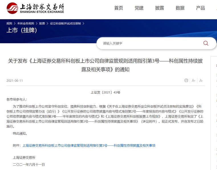 今年6月,上交所還發(fā)布了一則“關于發(fā)布《上海證券交易所科創(chuàng)板上市公司自律監(jiān)管規(guī)則適用指引第3號——科創(chuàng)屬性持續(xù)披露及相關事項》的通知”。