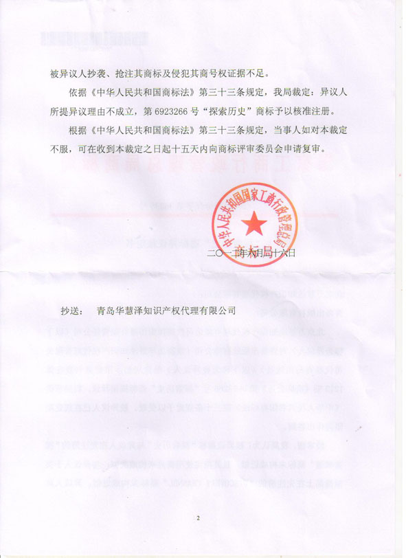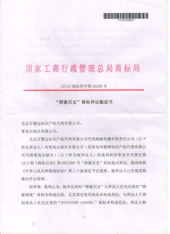 成功代理青島出版社有限公司“探索歷史”商標(biāo)異議答辯案