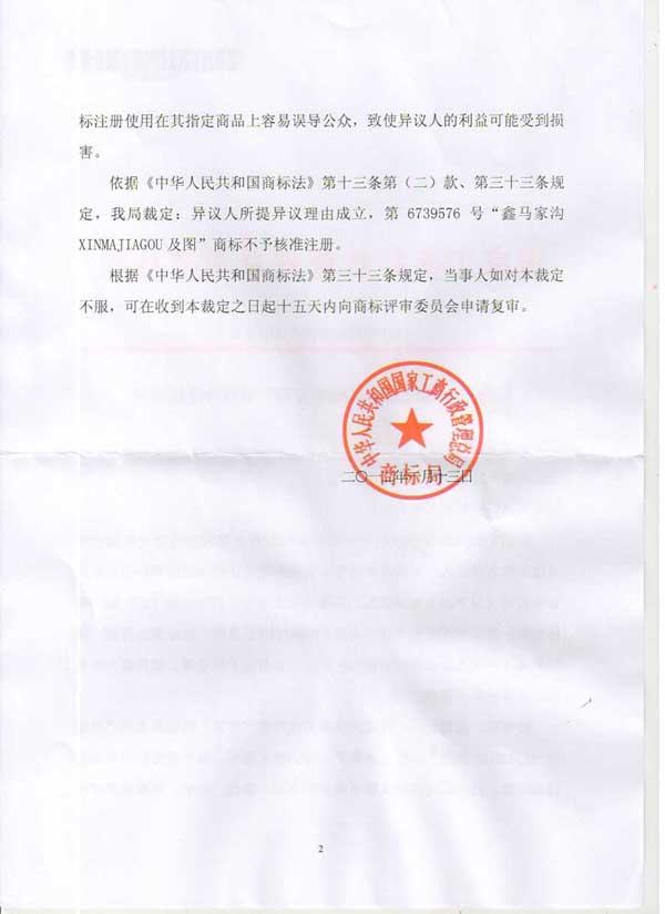 “鑫馬家溝xinmajiagou及圖”商標(biāo)異議裁定書