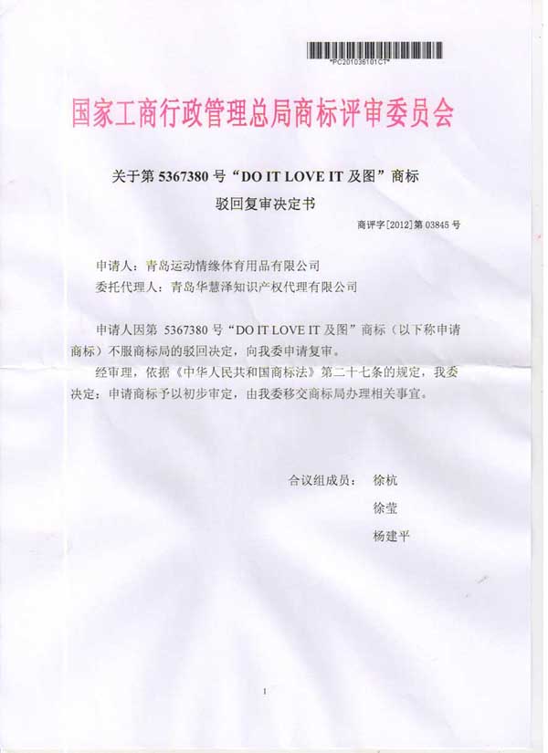 關(guān)于第5367380號“DOITLOVEIT及圖”商標(biāo)駁回復(fù)審決定書
