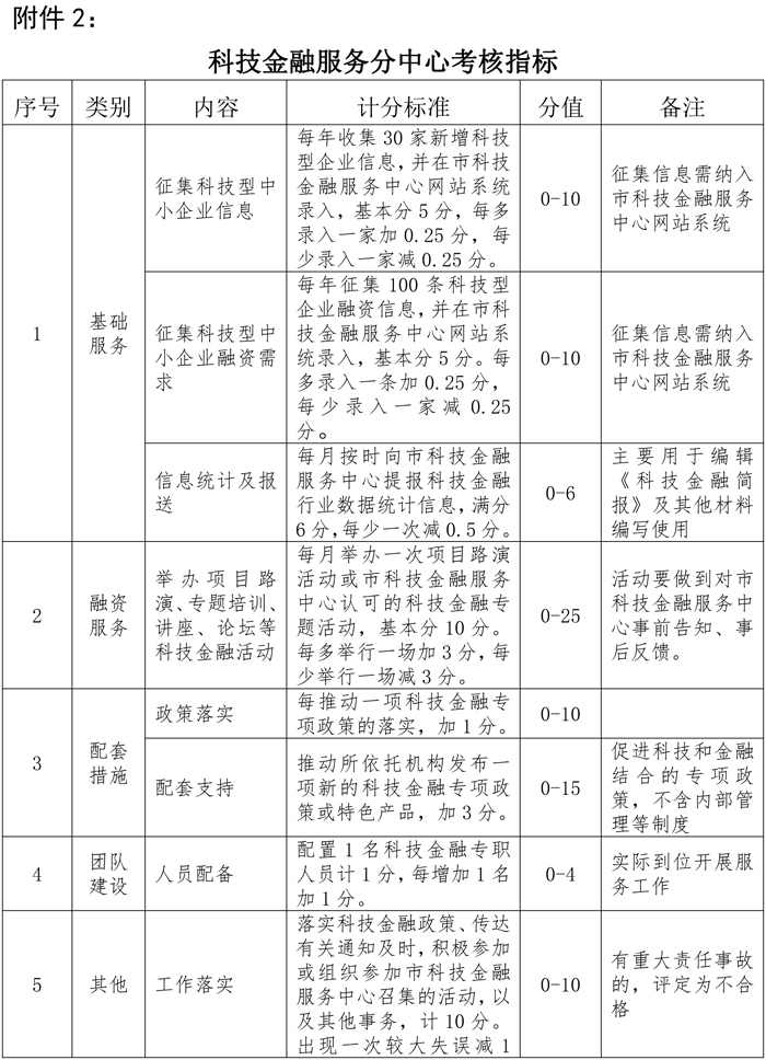 市科技金融服務(wù)中心負(fù)責(zé)對列入試點(diǎn)的各科技金融服務(wù)分中心組織考核,每年一次。